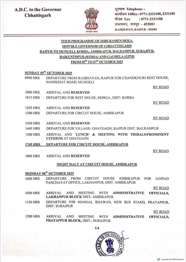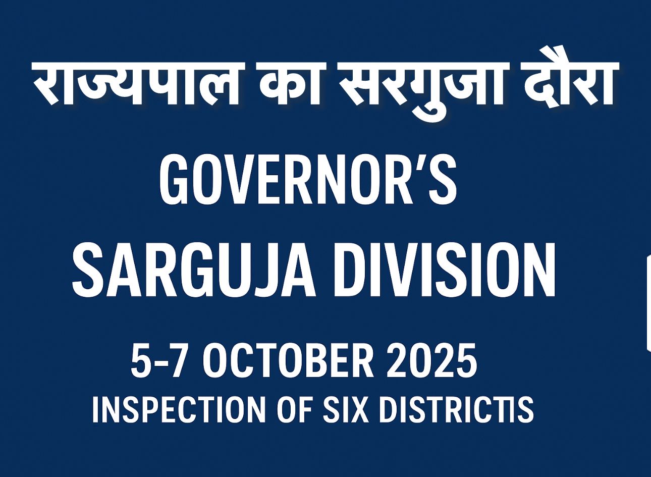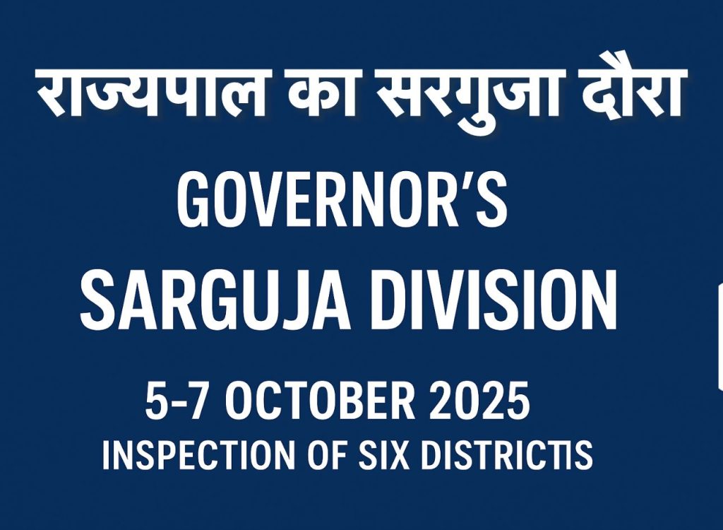 राज्यपाल का यह दौरा 7 अक्टूबर तक जारी रहेगा, जिसमें वे कोरिया (बैकुंठपुर) और गौरेला-पेंड्रा-मरवाही (GPM) जिलों में भी विभिन्न कार्यक्रमों में शामिल होंगे।