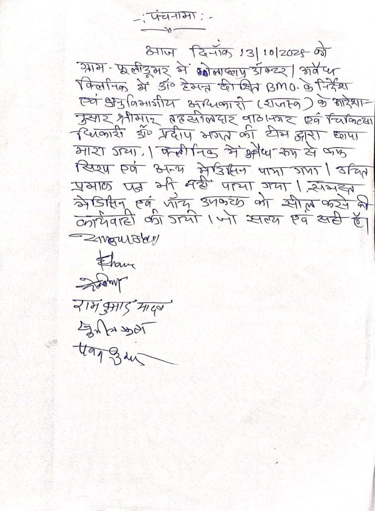 अचानक हुई इस कार्रवाई से क्षेत्र के झोलाछाप डॉक्टरों और बिना मान्यता प्राप्त क्लिनिक संचालकों में हड़कंप मचा हुआ है।