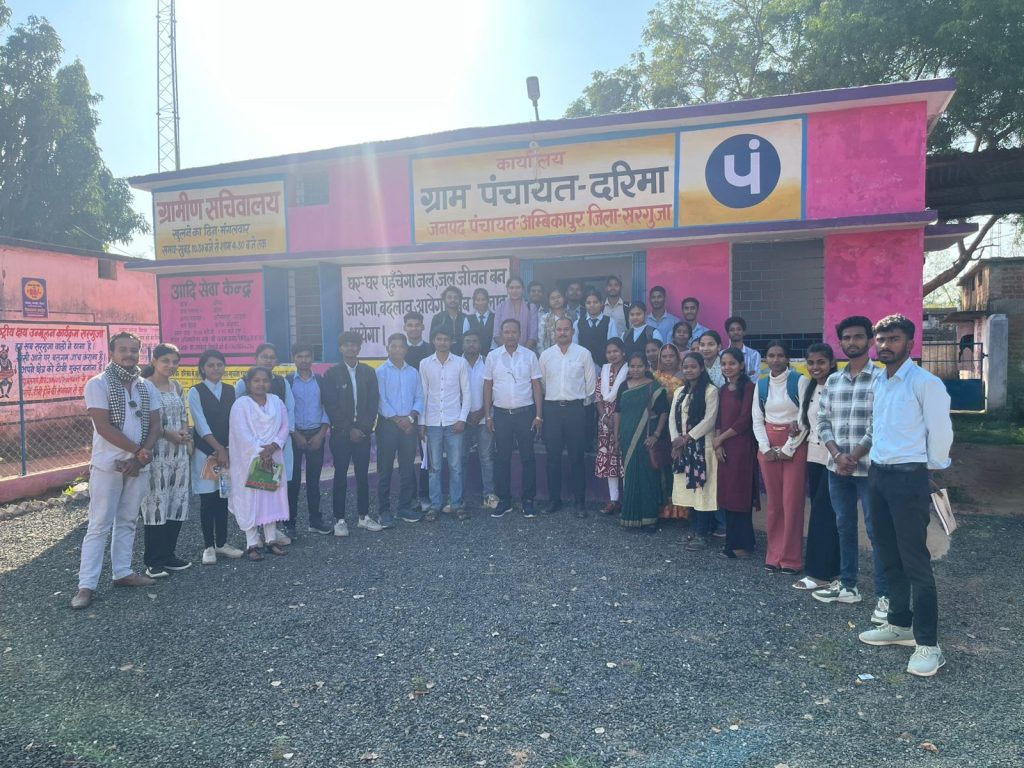 जिला पंचायत सरगुजा के सहयोग से राजीव गांधी शासकीय स्नातकोत्तर महाविद्यालय, अंबिकापुर के विद्यार्थियों ने हाल ही में ग्राम पंचायत मेंद्रा खुर्द और दरिमा का शैक्षणिक भ्रमण किया। यह भ्रमण “कम्युनिटी एंगेजमेंट एंड सोशल रिस्पॉन्सिबिलिटी” प्रमाणपत्र पाठ्यक्रम के अंतर्गत आयोजित किया गया, जिसे मुहिम फाउंडेशन और महाविद्यालय संयुक्त रूप से संचालित कर रहे हैं।