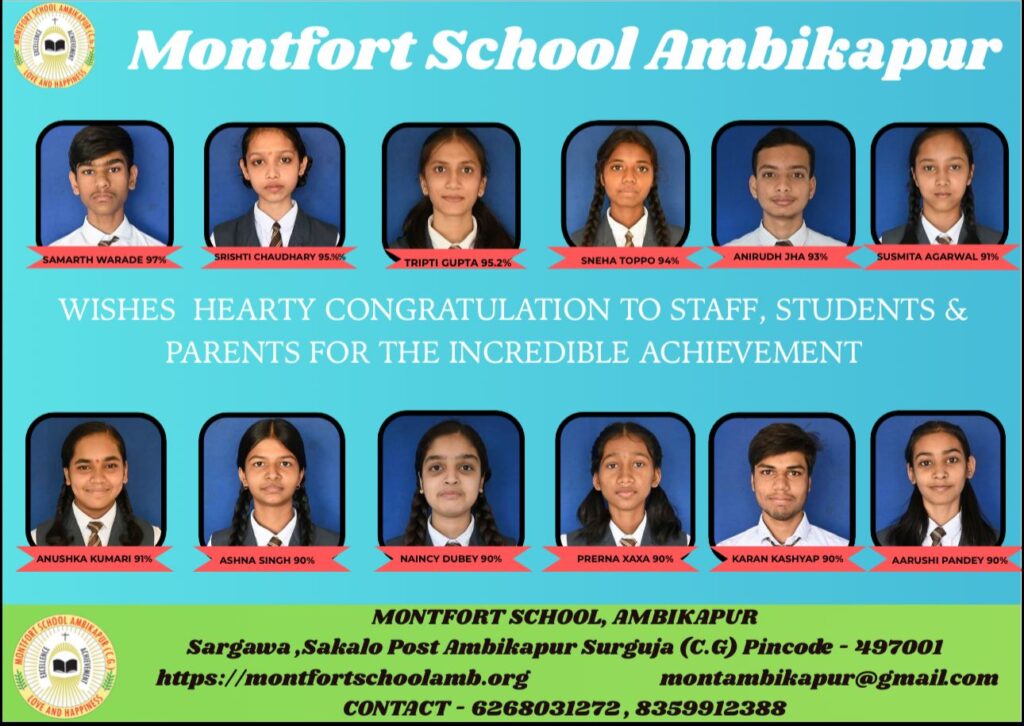 सी बी एस ई हाई स्कूल बोर्ड के परीक्षा परिणाम 2025-2026 की घोषणा इस वर्ष मोंटफोर्ट स्कूल अम्बिकापुर के लिए खुशियों की सौगातें लेकर आई । 12 विद्यार्थियों द्वारा इस वर्ष 10वी बोर्ड की परीक्षा में 90 प्रतिशत से अधिक अंक अर्जित कर विद्यालय का मान बढ़ाया । विद्यालय के गौरव सामार्थ वराडे ने इस वर्ष 10 वी बोर्ड में 97 प्रतिशत अंक अर्जित किया । इस वर्ष मोंटफोर्ट विद्यालय के हाईस्कूल का परीक्षा परिणाम शत प्रतिशत रहा ।